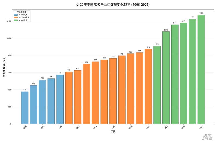 根据教育部最新发布的数据,2026届全国普通高校毕业生规模预计为1270万人,相比2025届增加48万人,又创历史新高。